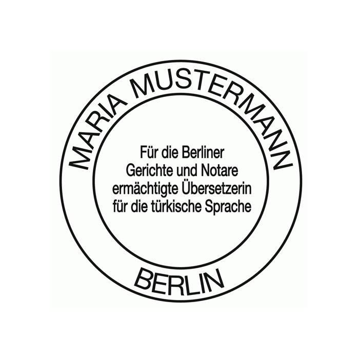Dieser Stempel dokumentiert offiziell, dass Sie Übersetzerin für die türkische Sprache in Berlin sind. Der Text im Mittelfeld ist auf Wunsch natürlich für andere Sprachen änderbar, nutzen Sie hierfür unseren freundlichen Kundenkontakt.